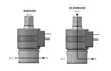 3-Way Directional Control Reverse Polarity Magnet Latching Valve - This type of valve is often used in remote areas where continuous power may not be available or with battery-powered portable equipment where power capacity is limited, as it only uses power during latching and un-latching.It is also valuable in equipment where coil heating, due to continuous application of power, is undesirable. Air and other fluids are compatible with standard Buna seals. Hot water, steam, gasoline, oils, some hydraulic fluids, and many other media require special seal materials.