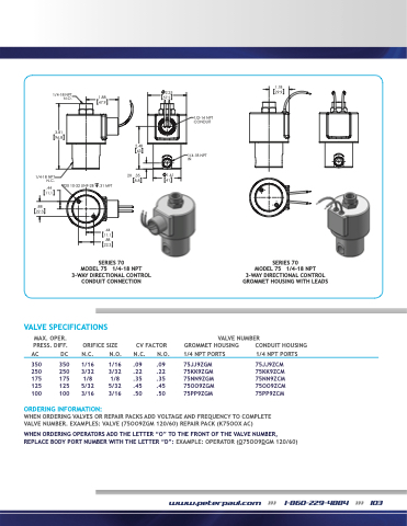 WHEN ORDERING VALVES OR REPAIR PACKS ADD VOLTAGE AND FREQUENCY TO COMPLETE VALVE NUMBER. EXAMPLES: VALVE (75OO9ZGM 120/60) REPAIR PACK (K75OOX AC)